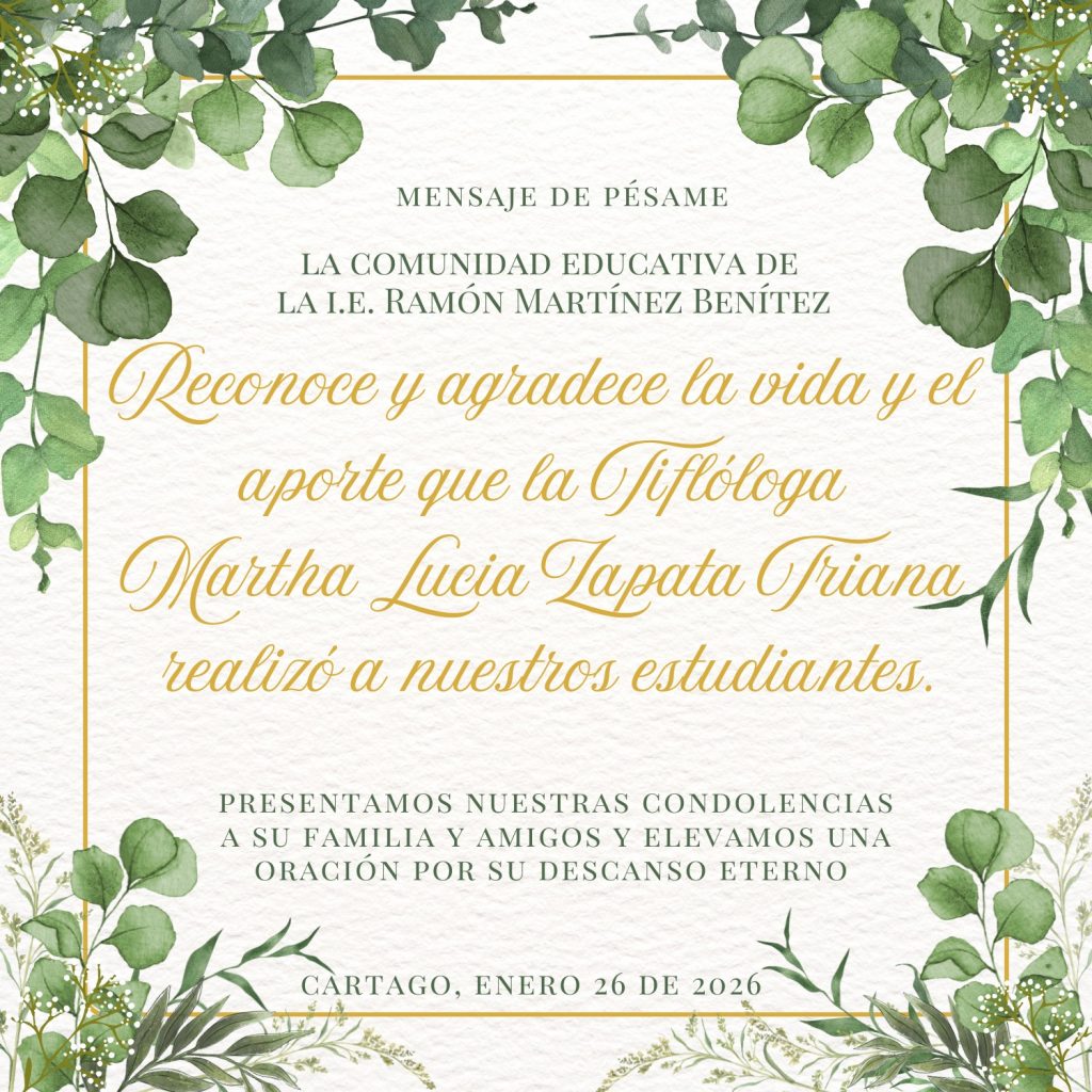 Con profundo respeto y el corazón lleno de gratitud, la familia de la institución educativa Ramón Martínez Benítez despide hoy a la Tiflóloga Martha Lucía Zapata Triana. Agradecemos su invaluable entrega y el profundo impacto que dejó en la vida de nuestros estudiantes.