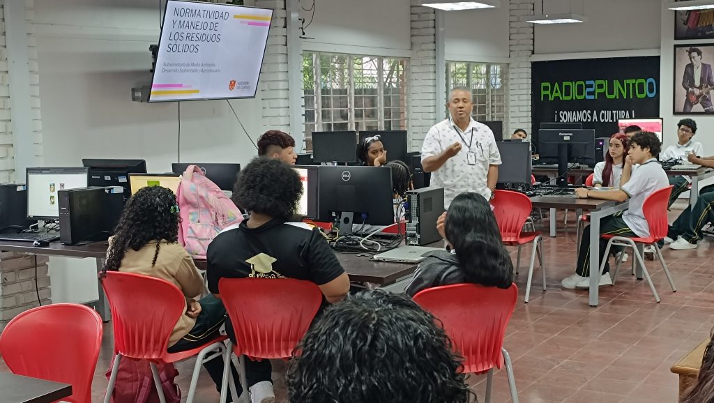 🌱 La visión de los estudiantes. Los jóvenes también compartieron sus impresiones sobre la actividad. Alexander Parra, estudiante de 11°, comentó: «Uno a veces no piensa en dónde termina la basura que bota. Esta charla nos abrió los ojos. Ahora entiendo que reciclar no es solo separar por separar, es saber que cada cosa tiene un lugar y que podemos reducir el daño al planeta». Por su parte, Manuel Alejandro Matallana, otro de los asistentes, agregó: «Me llamó mucho la atención lo estricta que es la ley si no manejamos bien los residuos, pero también me gustó que nos explicaron que no es solo multar, sino educar. Quiero aplicar esto en mi casa y enseñarle a mi familia».